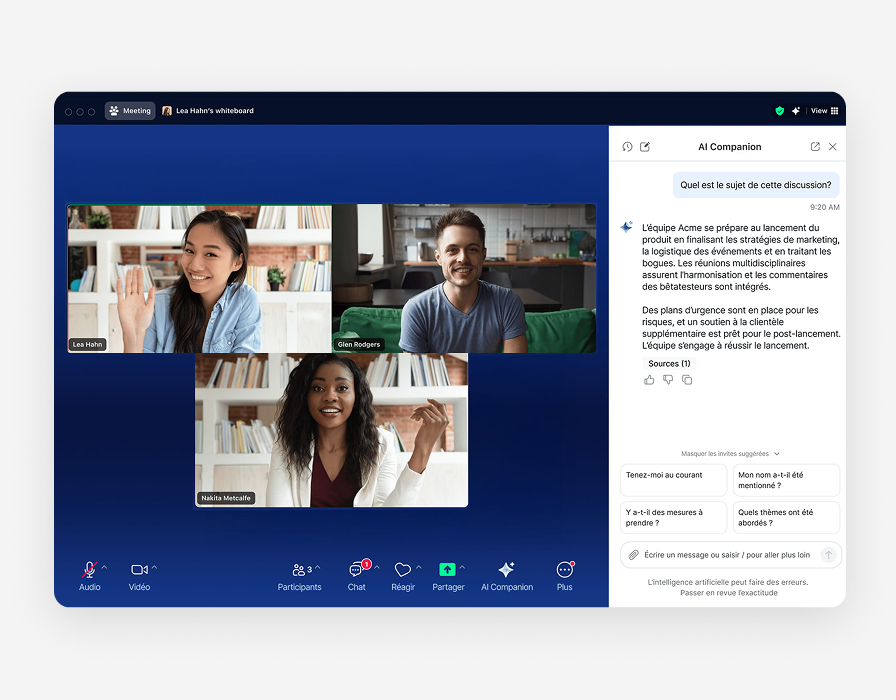 - Intégration native : Est intégré aux réunions, au clavardage, au téléphone et au tableau blanc.