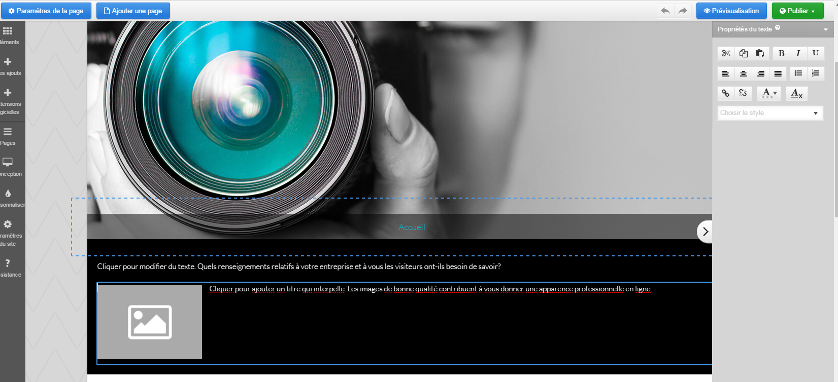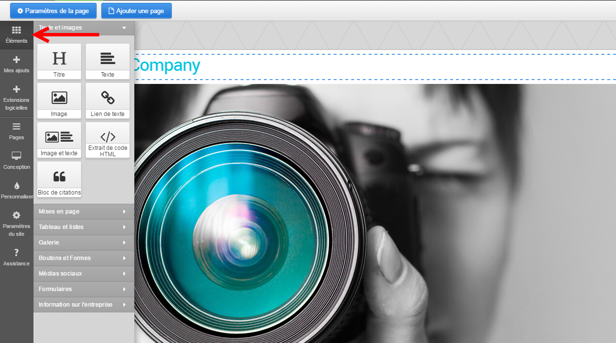 Ajoutez ensuite votre contenu. Cliquez sur la barre d’outils [Éléments], puis faites glisser divers éléments afin de les placer sur votre page Web.