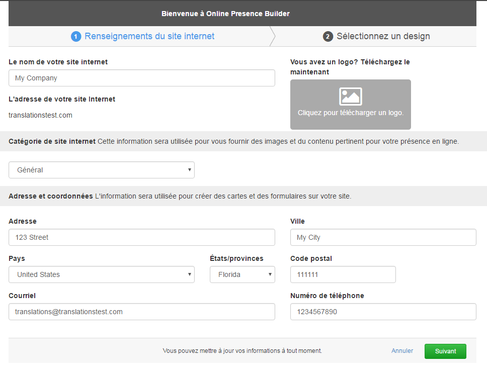 Saisissez tous les renseignements et Le Créateur de présence en ligne créera un cadre de base pour votre site web.
